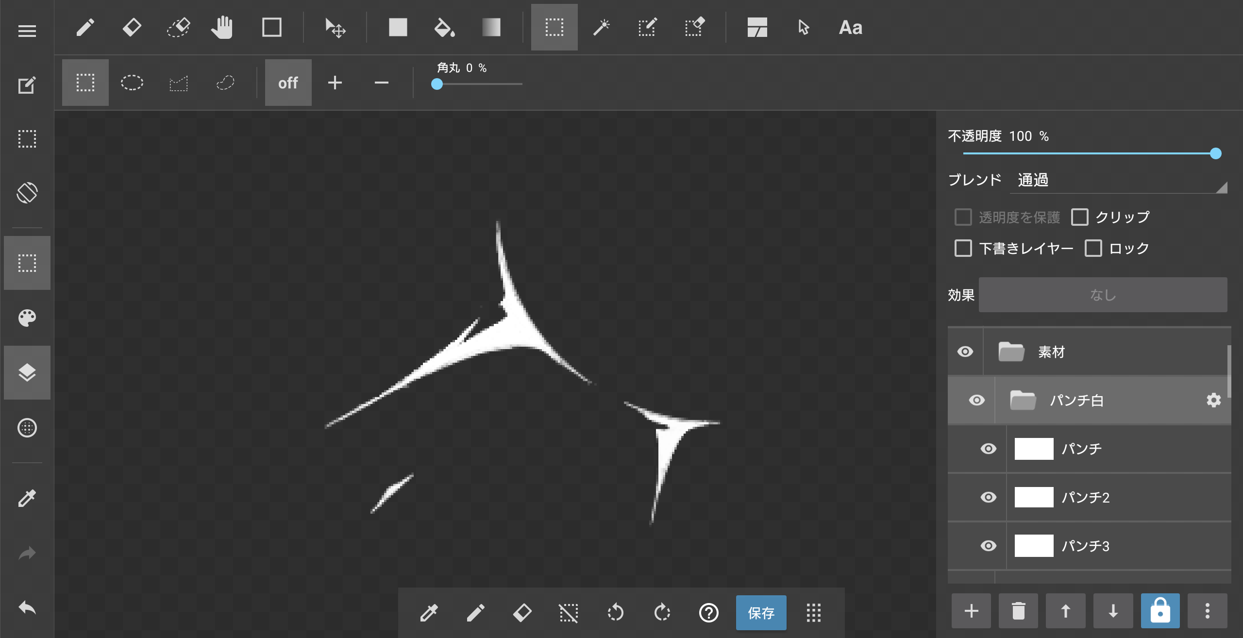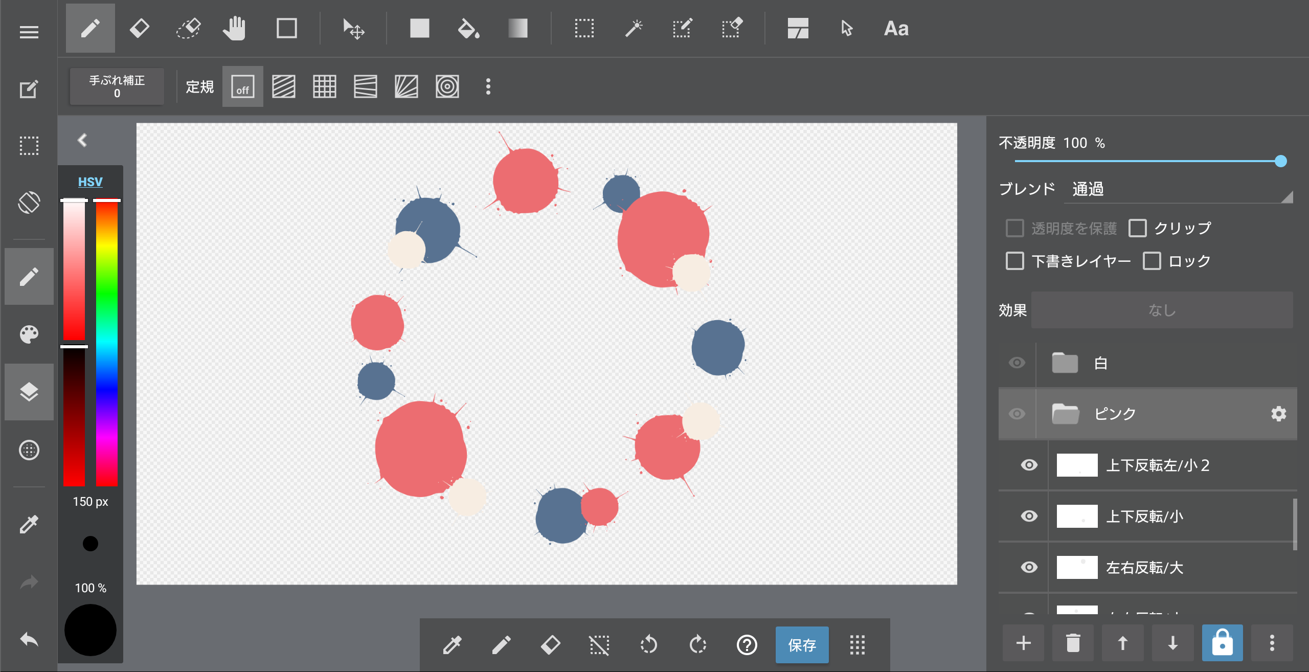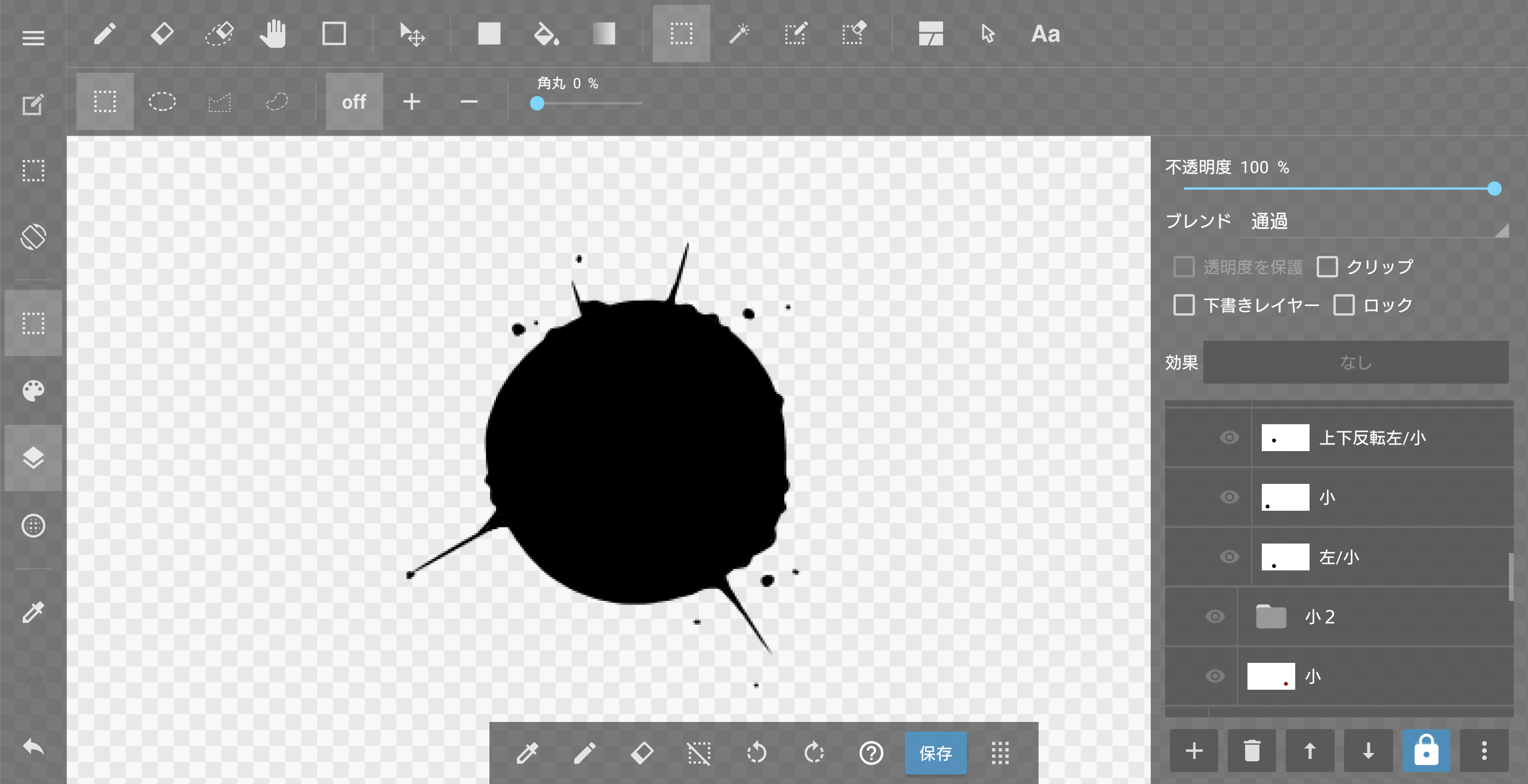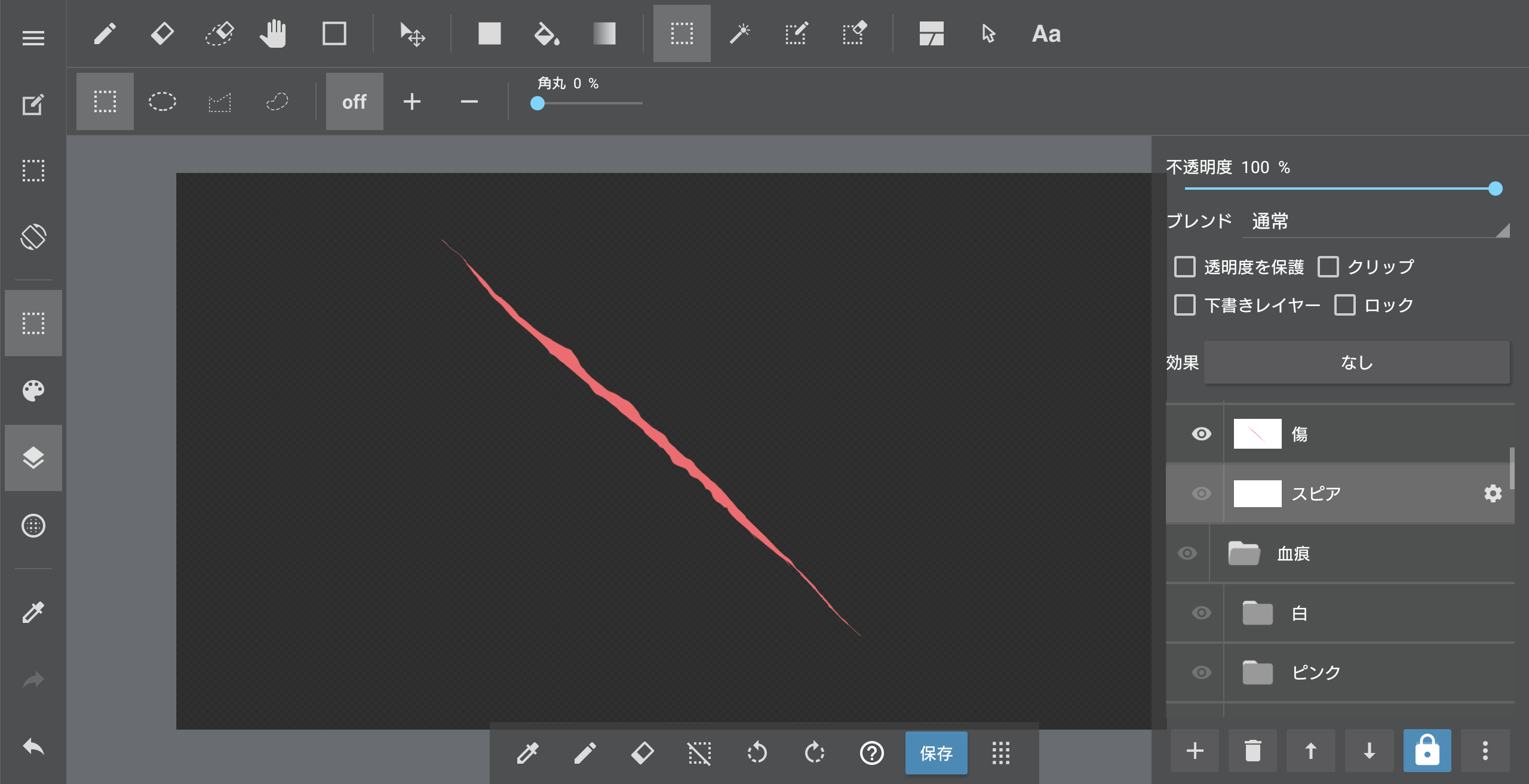1ピクセルのペンで細く線を引いてから、部分ごとに重ね書きして膨らませていきます。